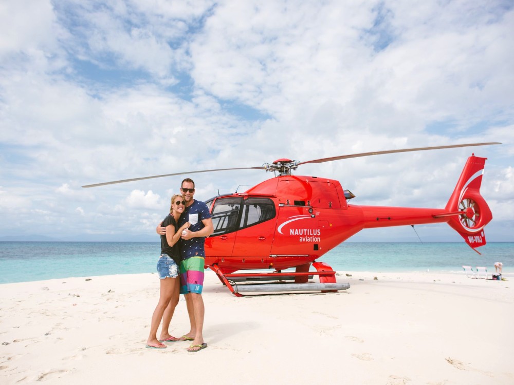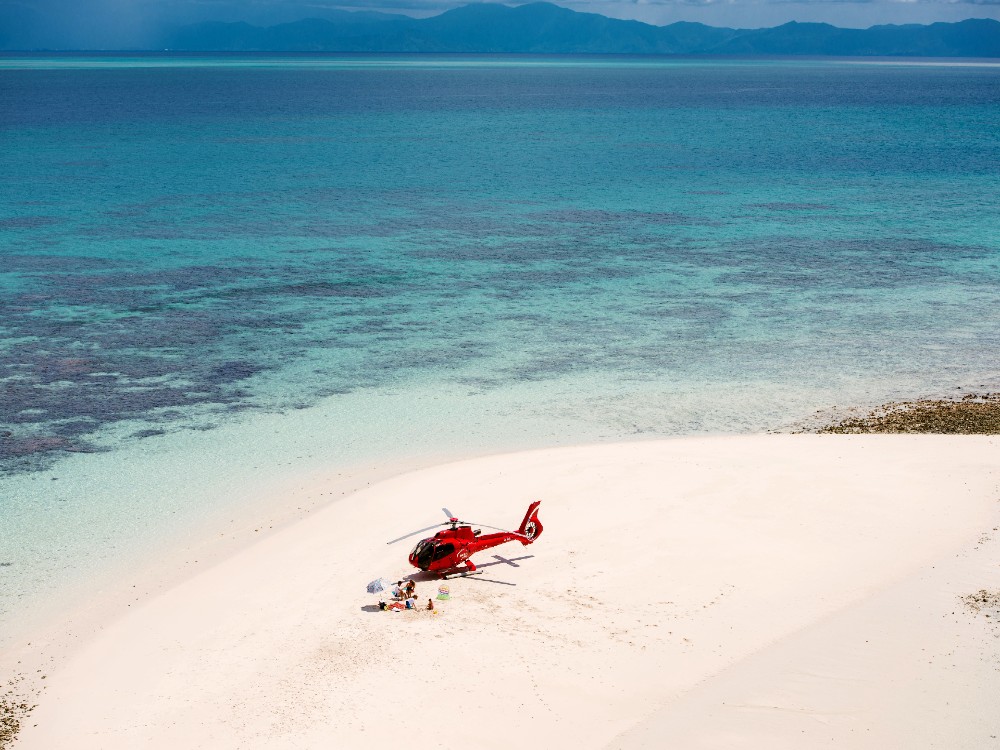 - Departing Cairns in your private charter helicopter, soak in breathtaking aerial views extending from the tropical rainforest clad coastline and across the azure waters of the Coral Sea before an exhilarating touchdown on idyllic Vlasoff Cay, a jewel in the heart of Australia’s World Heritage Listed Great Barrier Reef. Your highly skilled pilot will share their local knowledge of the region while on the lookout for Turtles, Dolphins, Manta Rays, large schools of pelagic fish and even majestic Humpback Whales (Jul-Sep). For the next 2 hours you can leave the world behind. Relax in the shallows, enjoy the sand between your toes or snorkel the pristine coral reef waters surrounding this secluded tropical paradise. A gourmet picnic hamper* with sparkling wine served under your private beach umbrella tops off this unique, once in a lifetime experience!